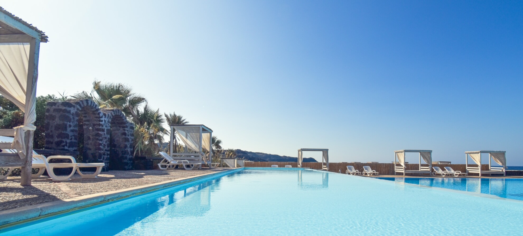 Les grandes piscines d'eau salée du Mursia Wellness Hotel sont une oasis surplombant la mer et le coucher du soleil.
